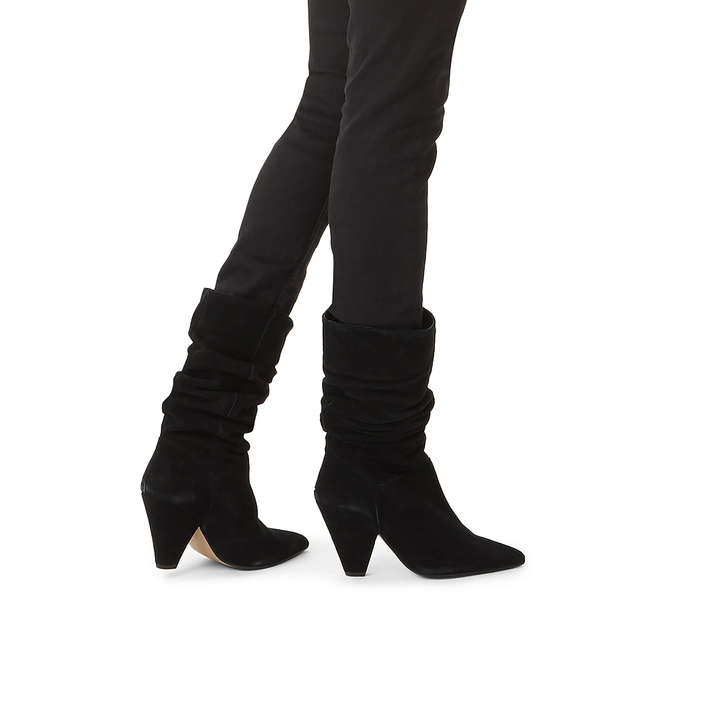 This season, put your best foot forward with confidence by donning Scrunch, the latest contemporary design from the new Carvela Kurt Geiger collection. A must-have addition to the modern wardrobe, this pointed-toe boot sports a pure suede construction with a 85mm covered-suede cone heel for stylish elevation. Complete with a 31.5cm ankle circumference and 23cm boot shaft height, this wearable boot transitions effortlessly from daytime cool to evening sophistication, with its pre-ruched effect ensuring a stylishly slouchy appearance. Made in Spain, with a soft black hue for versatile appeal around the clock.
